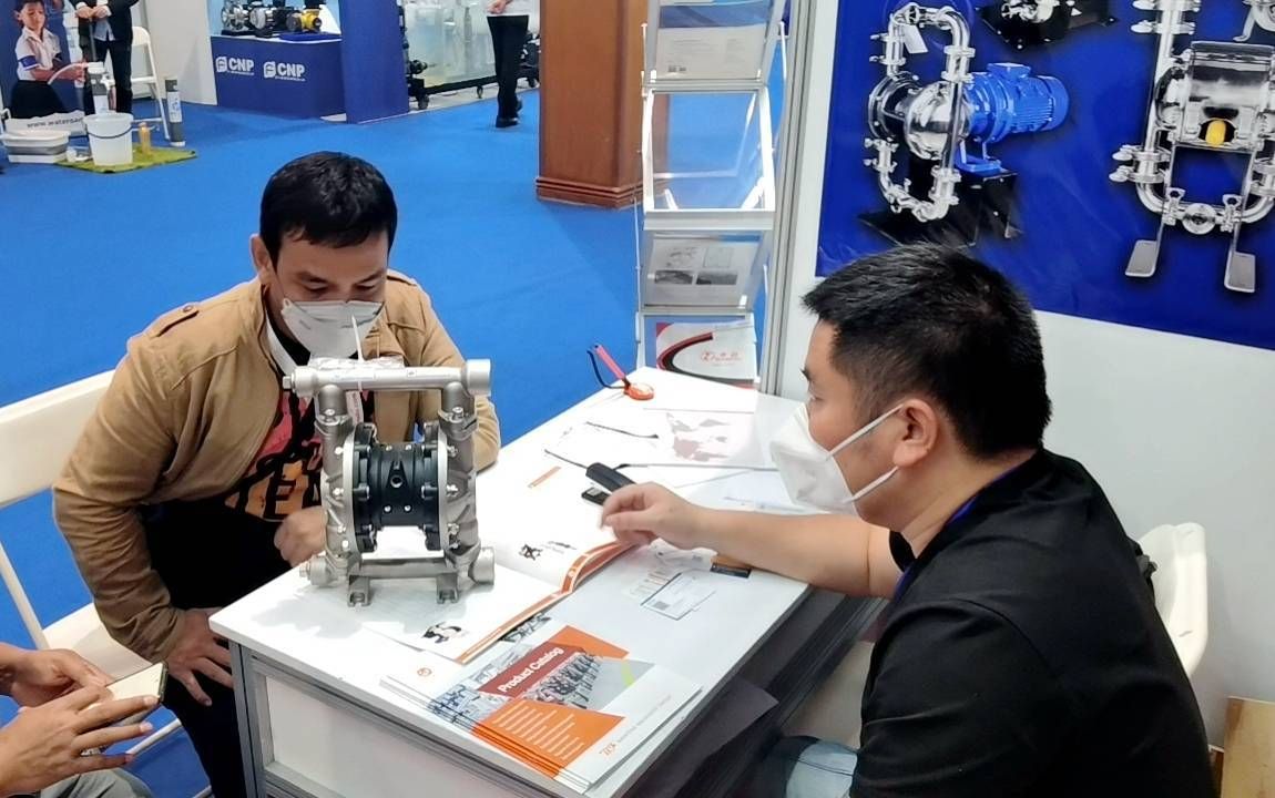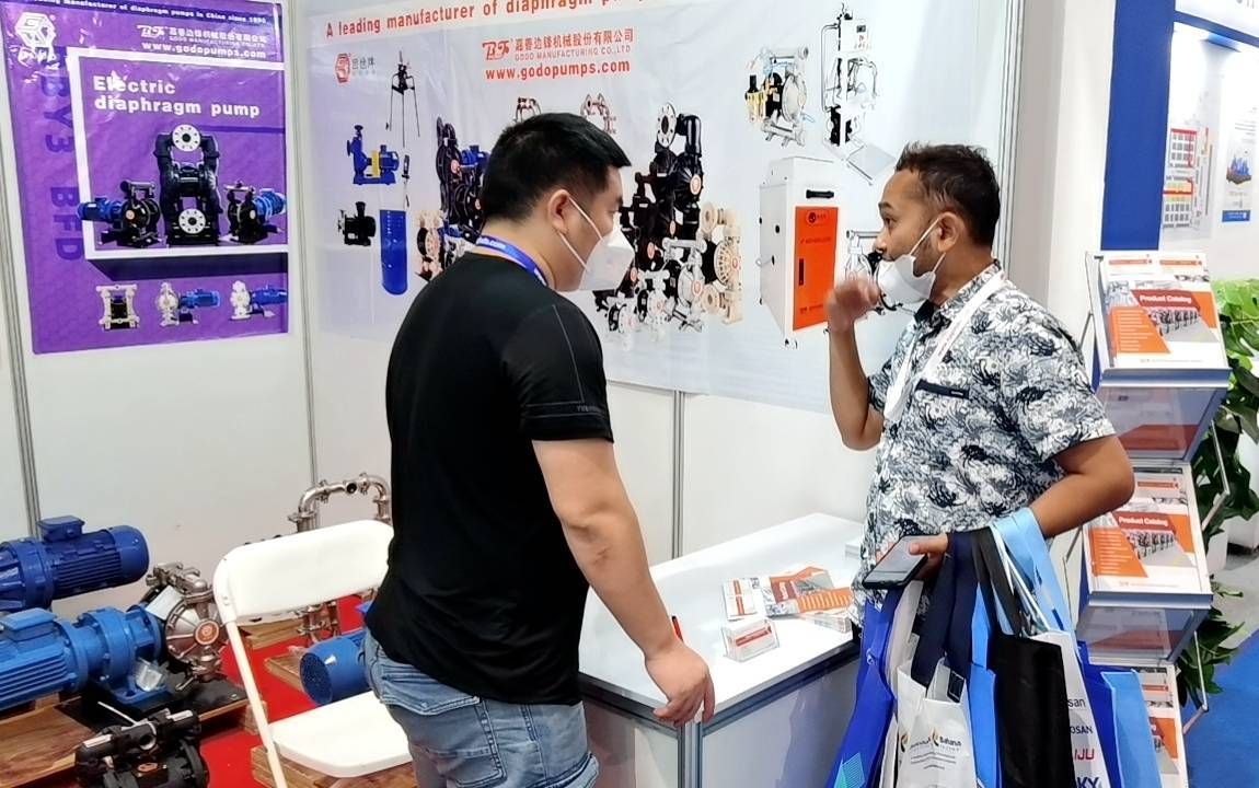 2022年10月5日,在国庆假期即将结束之际,黄金城集团集团国际事业部的同事们在结束泰国的旅程后,又闪现至印度尼西亚的雅加达会议中心,携气动隔膜泵、电动隔膜泵、卫生级隔膜泵、插桶泵等一众新老产品亮相“2022年印度尼西亚水处理展览会”。
